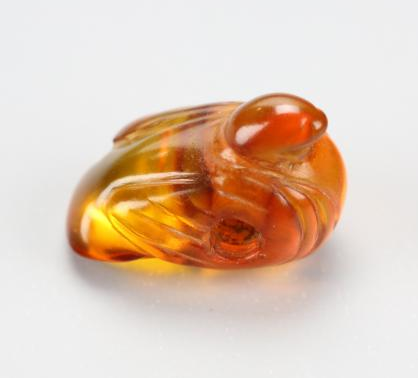 汉代,青岛西海岸新区张家楼街道土山屯出土。长1厘米,宽0.7厘米,高0.6厘米。饰件。琥珀质地,鸟形,通体磨光。汉代时人们将琥珀饰物穿戴在身上,不仅能用于装饰,更具有辟(bì)邪除凶、祈福迎祥的作用。