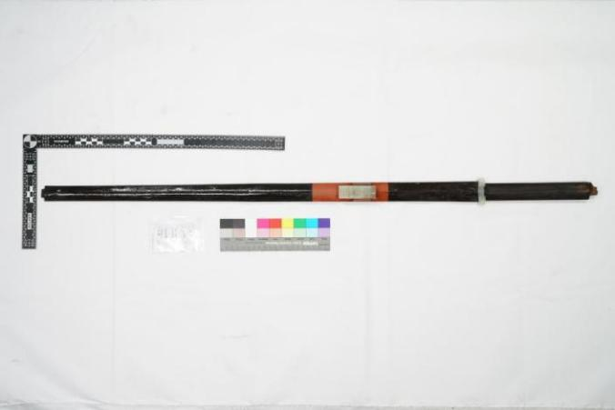 汉代,青岛西海岸新区张家楼街道土山屯出土。剑带鞘通长102.4厘米,剑身厚0.6厘米,鞘长80.6厘米,鞘最宽3.7厘米,茎长21厘米,茎柄宽3.2厘米,剑格长5.1厘米,宽1.5厘米,剑璏长7厘米,宽2.6厘米。同出衣物疏上称其为“玉具剑”。玉具剑是指用美玉装饰的佩剑。在古代,真正意义上发展成熟的玉具剑,主要由四部分玉饰组成,即:剑首、剑格、剑璏(zhì)、剑珌。
