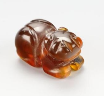 汉代,青岛西海岸新区张家楼街道土山屯出土。长2厘米,宽1厘米,高1厘米。饰件。琥珀质地,神兽形,卧姿。孙机认为,这种有孔可佩戴的狮子形琥珀珠饰,当供系臂之用,应称之为小辟(bì)邪,包含着辟去邪恶的用意。