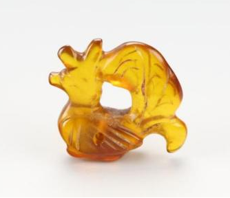 汉代,青岛西海岸新区张家楼街道土山屯出土。长1.5厘米,宽1.7厘米,高0.6厘米。饰件。琥珀质地,凤鸟形,透雕,通体磨光。汉代时人们将琥珀饰物穿戴在身上,不仅能用于装饰,更具有辟(bì)邪除凶、祈福迎祥的作用。